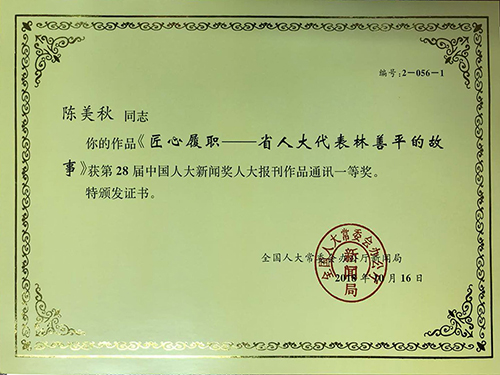 《匠心履職——省人大代表林善平的故事》獲得28屆中國人大新聞獎人大報(bào)刊作品通訊一等獎