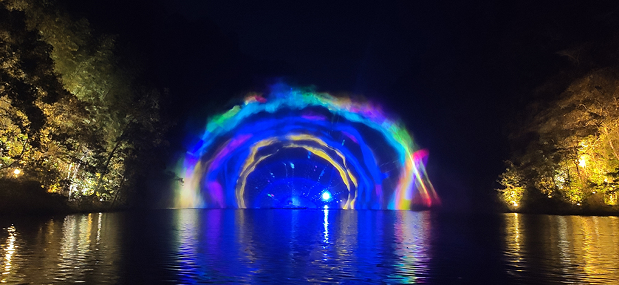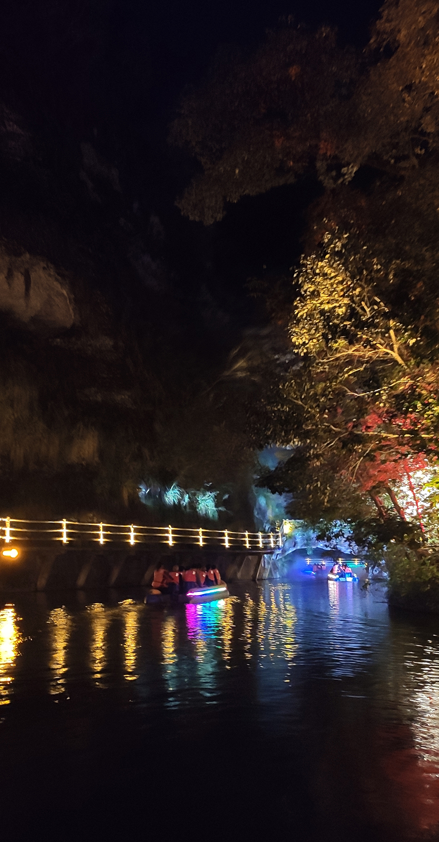 入夜,黨支部一行來到本次文旅最精彩的項目:“夜游九龍?zhí)?rdquo;。以“夜游九龍?zhí)叮o享夜的美”為主題的“行進(jìn)式”水上峽谷夜游景區(qū),利用現(xiàn)代化聲光技術(shù)與景區(qū)自然美景有機(jī)融合,讓您充分感受“詩意山水,光影幻境”。聽蛙唱蟲奏,觀月下仙境,月光映水,水波映月,加上臨水棧道邊笛聲陣陣......讓您真切的領(lǐng)會空靈、幽靜、夢幻的別樣意境。一路的聲光風(fēng)景讓人目不暇接,如果不是身臨其境,絕對感受不到那光影與大自然結(jié)合產(chǎn)生的絕妙意境。