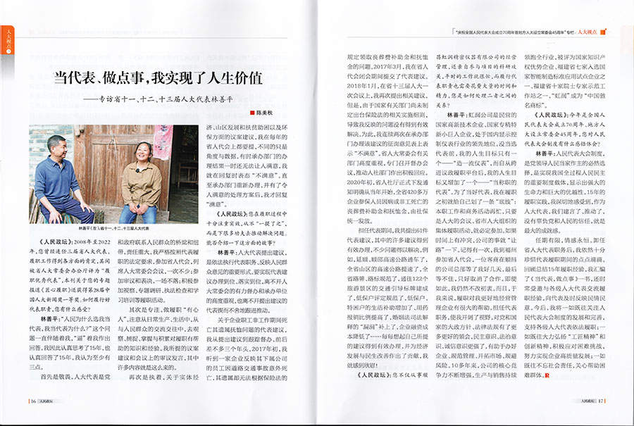 林善平:虹潤(rùn)公司是民營(yíng)的國(guó)家高新技術(shù)企業(yè)、國(guó)家專精特新小巨人企業(yè),處于國(guó)內(nèi)顯示控制儀表行業(yè)的領(lǐng)先地位。沒當(dāng)選代表前,我的人生目標(biāo)只有一個(gè)——“造一流儀表”,而自從跨進(jìn)議政履職平臺(tái)后,我的人生目標(biāo)又增加了一個(gè)——“當(dāng)稱職的代表”。為了當(dāng)好代表,我在履職之初就給自己劃了一條“底線”:本職工作和商務(wù)活動(dòng)再忙,只要是人大的會(huì)議、省市人大組織的集體履職活動(dòng),就必定參加。如果時(shí)間上有沖突,公司的事就“讓路”一下。記得有一次,我到福州參加省人代會(huì),一位客商在順昌的公司總部等了我好幾天,最后等不住,只好取消了合作。即便如此,我仍然不改初衷。而且,于我來說,履職對(duì)我更好地經(jīng)營(yíng)管理企業(yè)有很大的幫助。擔(dān)任代表職務(wù),使我開闊了視野,對(duì)黨和國(guó)家的大政方針政策、法律法規(guī)有了更多更好的領(lǐng)會(huì),民主意識(shí)、法治意識(shí)、誠(chéng)信意識(shí)更強(qiáng)了,有助于辦好企業(yè)、規(guī)范管理、開拓市場(chǎng)、規(guī)避風(fēng)險(xiǎn)。10多年來,公司的核心競(jìng)爭(zhēng)力不斷增強(qiáng),生產(chǎn)與銷售持續(xù)領(lǐng)跑全行業(yè),被評(píng)為國(guó)家知識(shí)產(chǎn)權(quán)優(yōu)勢(shì)企業(yè)、福建省七家入選國(guó)家智能制造標(biāo)準(zhǔn)應(yīng)用試點(diǎn)企業(yè)之一、福建省十家院士專家示范工作站之一,“虹潤(rùn)”成為“中國(guó)馳名商標(biāo)”。