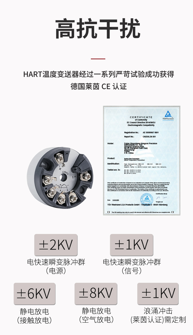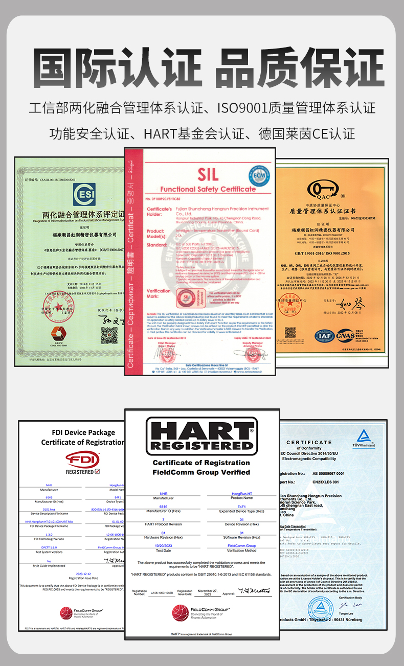 虹潤(rùn)公司是專業(yè)生產(chǎn)溫度變送器的國(guó)家專精特新“小巨人”企業(yè)。生產(chǎn)的智能溫度變送器,具有適配各類溫度傳感器,精度高,通過(guò)編程線修改輸入信號(hào)類型及量程,高抗干擾,HART或485通訊等特點(diǎn)。該產(chǎn)品不僅通過(guò)HART基金會(huì)認(rèn)證、德國(guó)萊茵 CE 認(rèn)證與 SIL 功能安全認(rèn)證,還獲得具備減震抗干擾能力的溫度變送器、信號(hào)隔離器、一種二端子模塊、無(wú)源信號(hào)隔離器等4項(xiàng)國(guó)家發(fā)明專利,主持起草物聯(lián)網(wǎng)智能溫度儀表、現(xiàn)場(chǎng)設(shè)備工具(FDT)接口規(guī)范、工業(yè)過(guò)程測(cè)量和控制系統(tǒng)用溫度變送器等3項(xiàng)國(guó)家標(biāo)準(zhǔn),以及通信系統(tǒng)多通道數(shù)據(jù)采集控制終端規(guī)范軍用標(biāo)準(zhǔn),參與國(guó)際5G標(biāo)準(zhǔn)制定,取得HART溫度變送器、智能溫度變送器等3項(xiàng)相關(guān)軟件著作權(quán)。產(chǎn)品廣泛應(yīng)用于石油、化工、電力、冶金、制藥、食品、水處理等各種工業(yè)領(lǐng)域。