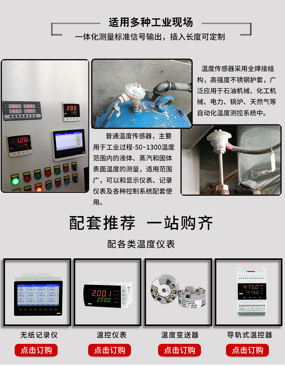 裝配式熱電阻熱電偶作為溫度測量傳感器,通常與溫度變送器、調(diào)節(jié)器及顯示儀表等配套使用,組成過程控制系統(tǒng),用以直接測量或控制各種生產(chǎn)過程中流體、蒸汽和氣體介質(zhì)以及固體表面等溫度。