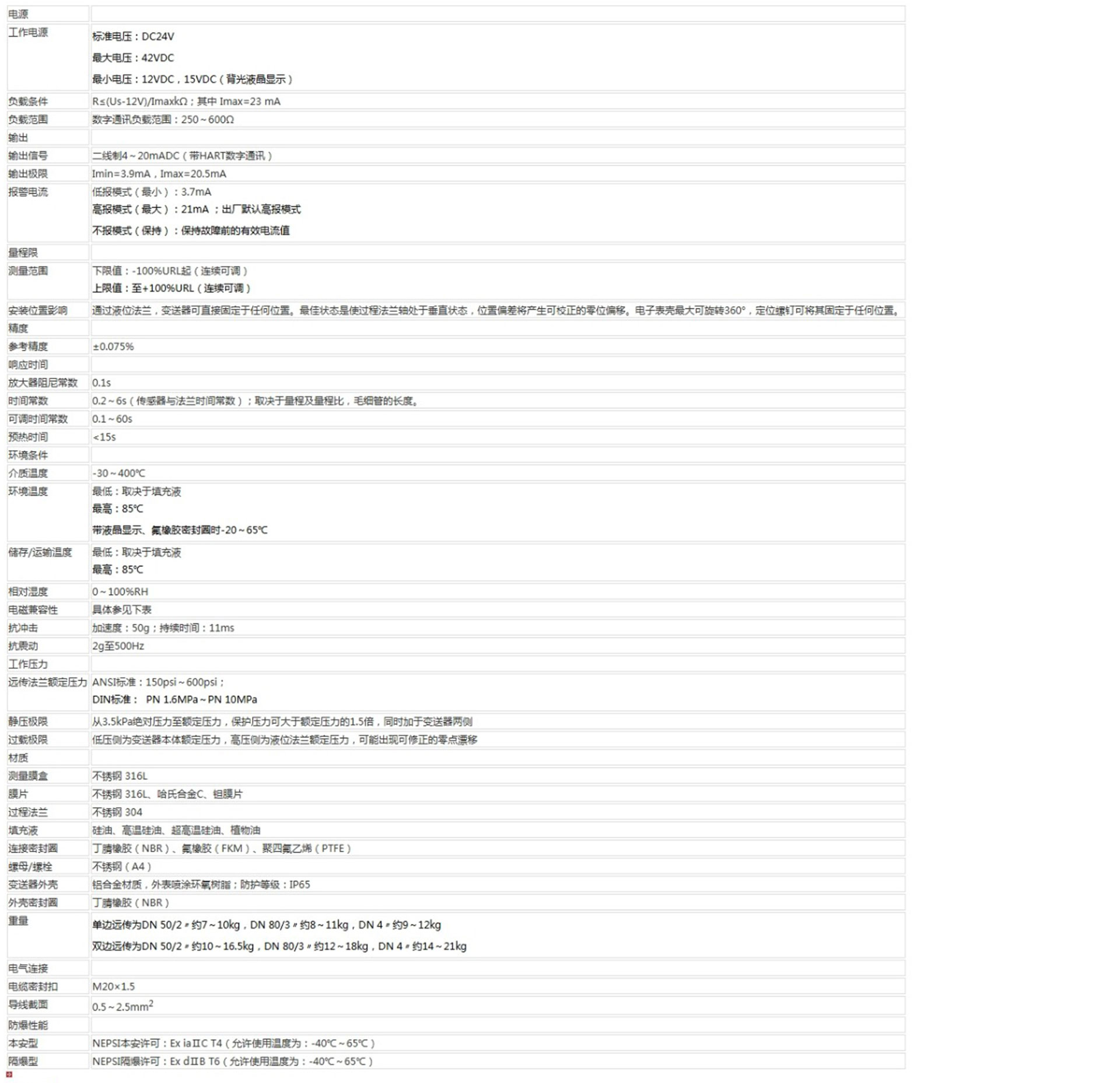 該產(chǎn)品用于測量液體、氣體或蒸汽的液位、密度、壓力,將其轉(zhuǎn)變成4~20mA (HART)電流輸出信號,可通過RST375手持終端對它們進行參數(shù)設(shè)定、過程監(jiān)控等。測量范圍(未遷移時)為0-1kPa~2MPa,液位法蘭的額定壓力分別為:1.6/4MPa、6.4MPa、10MPa、150psi、300psi或600psi。