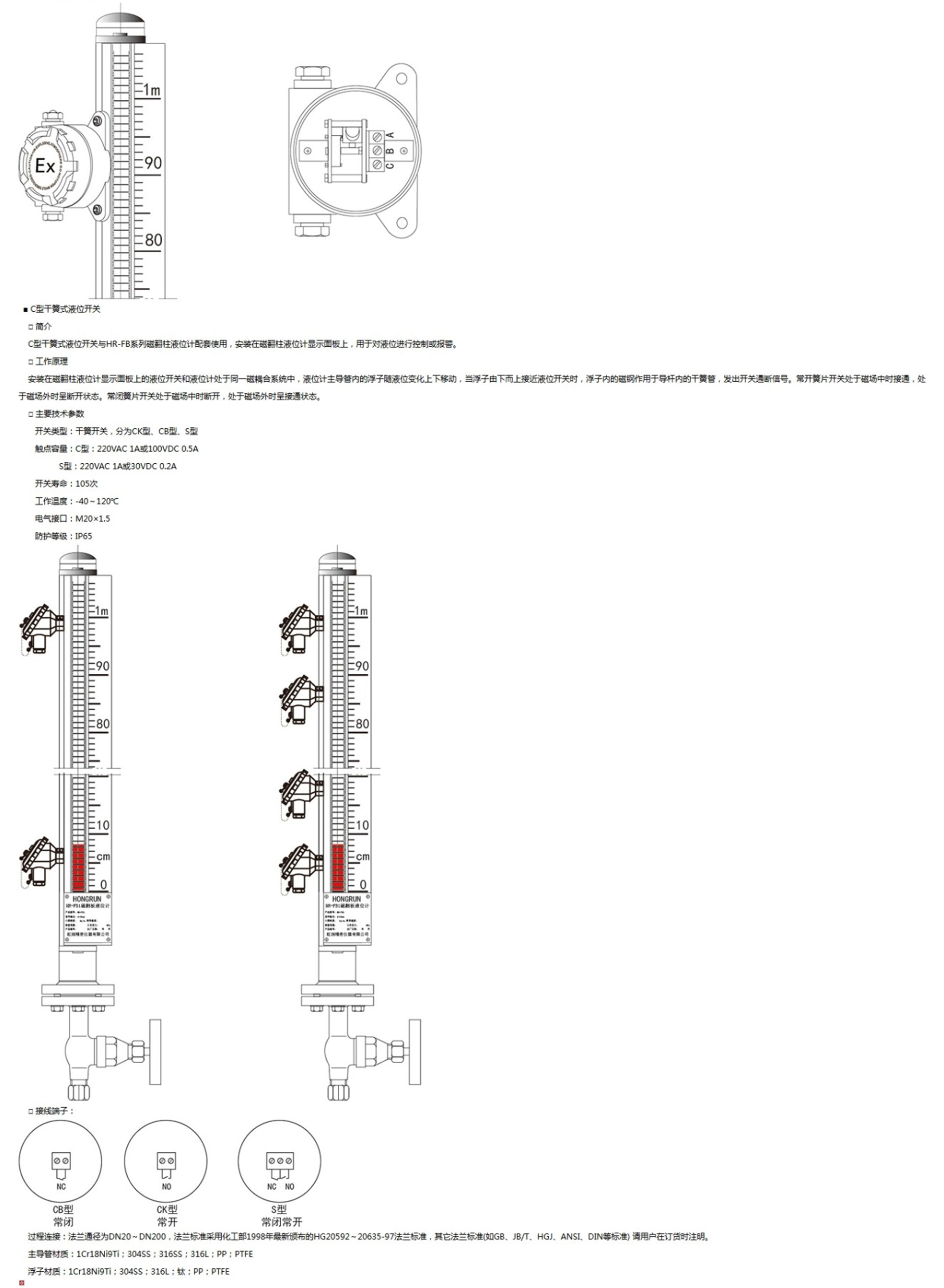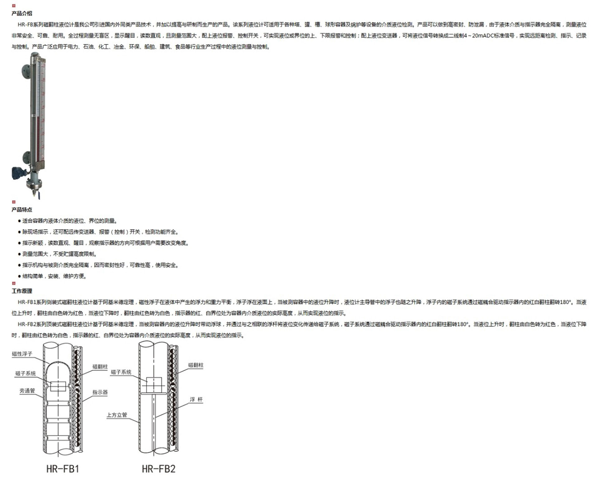 HR-FB系列磁翻柱液位計(jì)是我公司引進(jìn)國(guó)內(nèi)外同類產(chǎn)品技術(shù),并加以提高與研制而生產(chǎn)的產(chǎn)品。該系列液位計(jì)可適用于各種塔、罐、槽、球形容器及鍋爐等設(shè)備的介質(zhì)液位檢測(cè)。產(chǎn)品可以做到高密封、防泄漏,由于液體介質(zhì)與指示器完全隔離,測(cè)量液位非常安全、可靠、耐用。